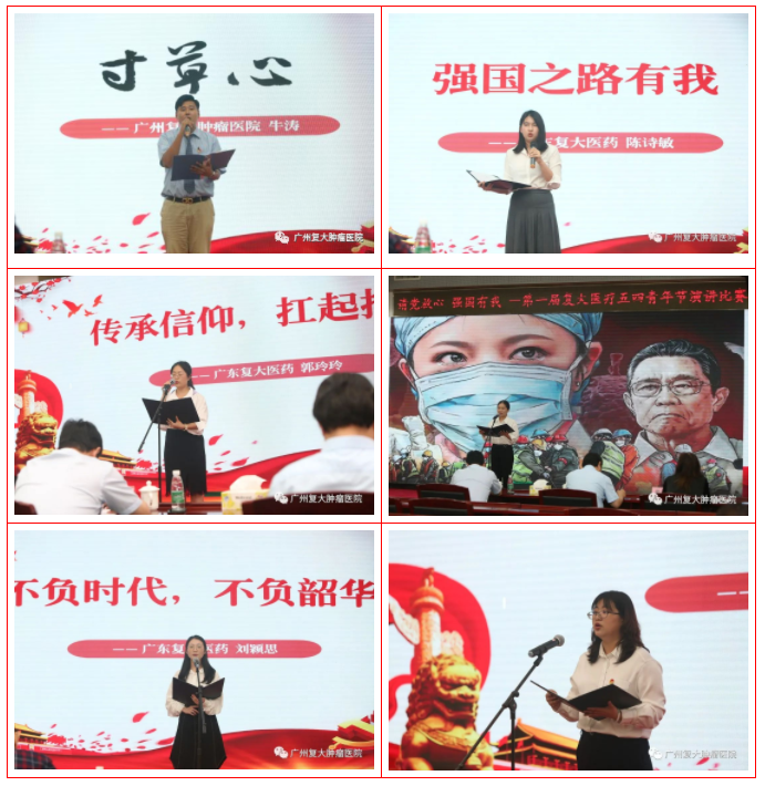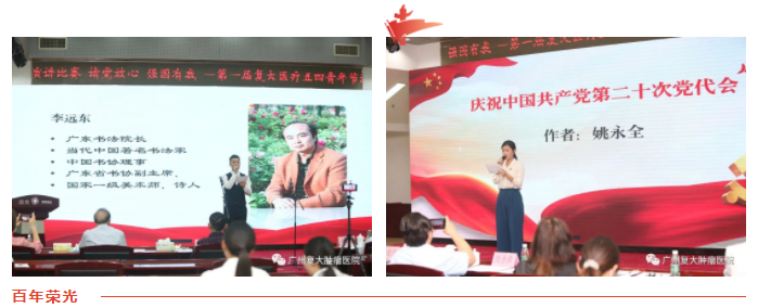 在广州复大肿瘤医院有一群这样的人,他们是在抗疫现场挥洒汗水的青年;是在无影灯下争分夺秒抢救生命的青年;是在实验室里探索肿瘤奥秘的青年;是社区传播健康知识的青年……为了治病救人的初心,为了肿瘤防治事业,我们一直在努力。回望百年,青春向党,时光不老,青春正好。赛场上,选手们围绕“请党放心,强国有我”为主题,结合自身工作的所感所想、亲身经历,用朴实真挚的语言,声情并茂、激情饱满地抒发了对祖国、对医院工作的热爱与感恩,为建团百年献礼。整场比赛精彩纷呈,一次次引得场下评委和观众的掌声。