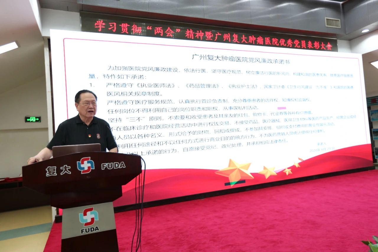 为加强医院党风廉政建设,由时代楷模徐克成同志代表全体党员宣读广州复大肿瘤医院党风廉政承诺书,号召全体党员强化党风廉政建设,端正工作作风,不断提高廉洁自律意识,加强自我约束力,不断提高医疗技术水平,才能为患者提供优质医疗服务,构建风清气正、医患和谐的医疗环境,促进医院健康发展。