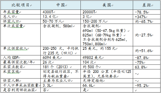 8、中美有偿单采血浆相关情况比较表(2012年)